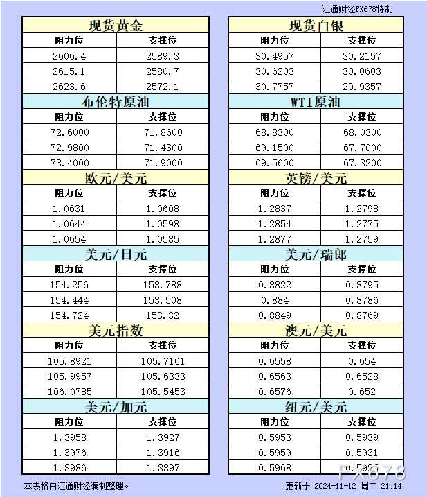 ——11月12日美市更新的黃金、白銀、原油、美元指數(shù)、歐元、英鎊、日元、瑞郎、澳元、加元、紐元支撐阻力位一覽。