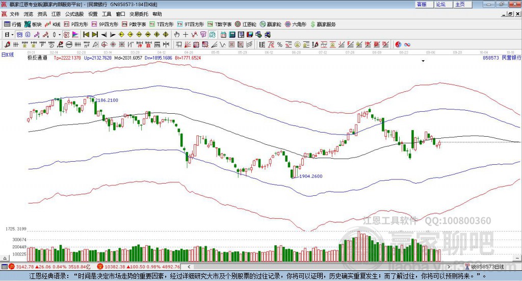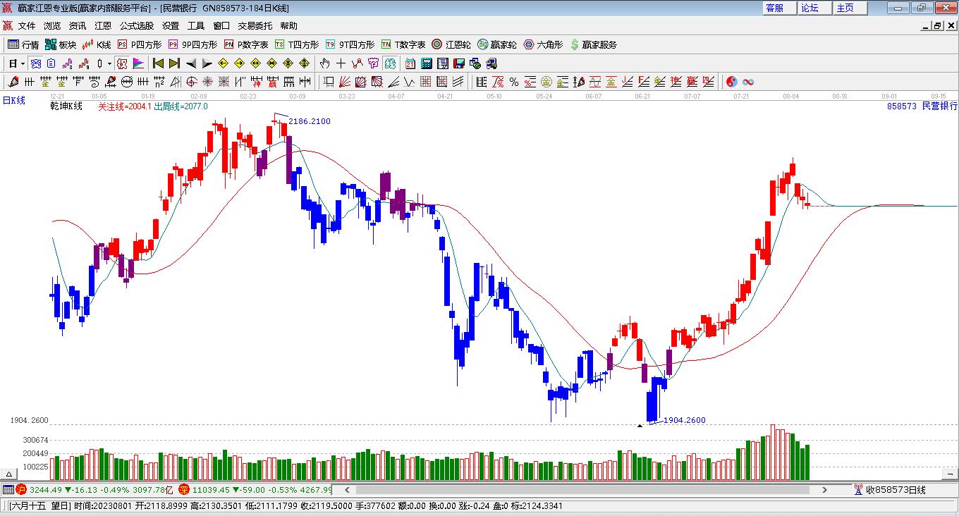 本日概念以上下影小陽(yáng)線收盤,由藍(lán)色區(qū)域進(jìn)入紫色區(qū)域(多空爭(zhēng)奪期),同時(shí)挑戰(zhàn)關(guān)注線,依據(jù)贏家江恩乾坤K線多空模型,如能突破并站穩(wěn)關(guān)注線,則將由紫色區(qū)域進(jìn)入紅色區(qū)域,這也預(yù)示著波段開始走強(qiáng);如不能有效突破關(guān)注線,由紫色區(qū)域再次進(jìn)入藍(lán)色區(qū)域,調(diào)整周期將會(huì)進(jìn)一步延長(zhǎng)。