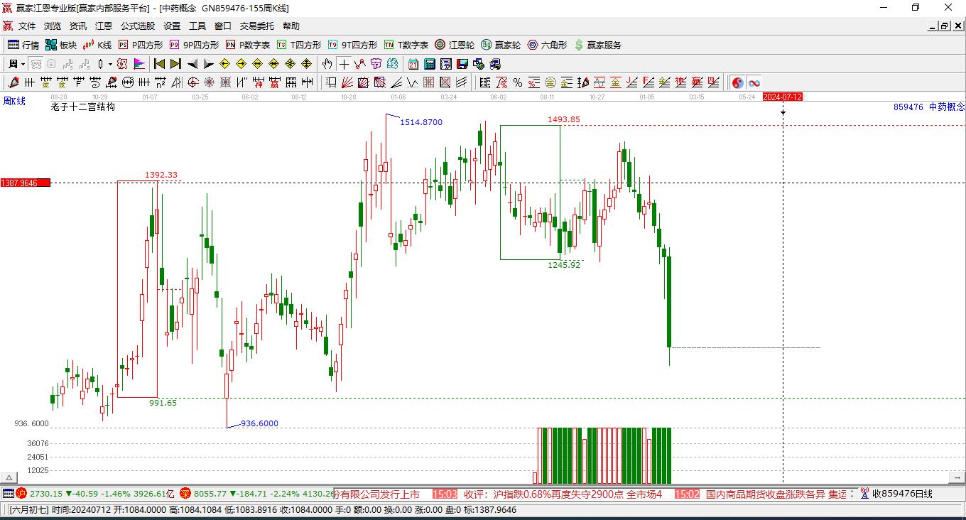 本周概念處于前期2024年8月2日形成的下跌結(jié)構(gòu)頂部線1197.95點上方,近期概念在此位置呈現(xiàn)震蕩走勢,震蕩區(qū)間為1331.84-1167.08,本周收盤1200.91點,微跌1.04%。依據(jù)贏家十二宮多空能量守恒規(guī)則,下跌結(jié)構(gòu)頂部線是多空能量轉(zhuǎn)換的關(guān)鍵位置,多方能量已連續(xù)釋放,空方能量不斷聚集。當前概念若能站穩(wěn)上漲結(jié)構(gòu)頂部線1197.95,多方有望再一次發(fā)動上攻,若跌破上漲結(jié)構(gòu)頂部線,則概念將會向下警戒線1075.04點位置附近尋找新的平衡位。