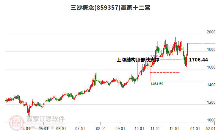 當前處于45天前形成的贏家十二宮上漲結(jié)構(gòu)頂部線1706.44點上方,目前此位置由前方高點12月23日下跌至今日,跌幅6.26%。依據(jù)贏家十二宮結(jié)構(gòu)規(guī)則,若跌破頂部線,多方能量持續(xù)衰減,上漲動能不足,空方能量占據(jù)主導,向下警戒線1561.77點尋找多空能量平衡位。