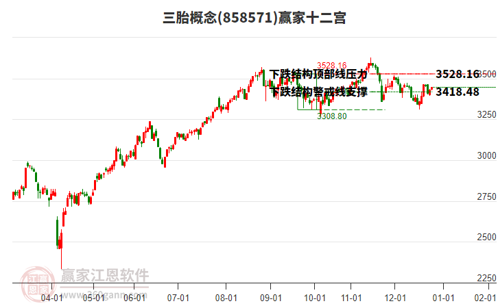 概念于12月23日高點(diǎn)3466.32,展開一波下跌,今日跌破生命線3457.4276點(diǎn),進(jìn)入弱勢(shì)通道, 依據(jù)極反通道規(guī)則,失守一線,看低一線,短期走弱,若此處不能收復(fù)生命線,則繼續(xù)下探至弱勢(shì)通道線附近尋找支撐。