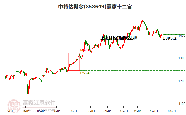 當(dāng)前處于300天前形成的贏家十二宮上漲結(jié)構(gòu)頂部線1395.2點(diǎn)上方,目前此位置由前方低點(diǎn)12月17日上攻至今日,漲幅達(dá)3.44%。依據(jù)贏家十二宮結(jié)構(gòu)規(guī)則,若跌破頂部線,多方能量持續(xù)衰減,上漲動(dòng)能不足,空方能量占據(jù)主導(dǎo),向下警戒線1212.93點(diǎn)尋找多空能量平衡位。