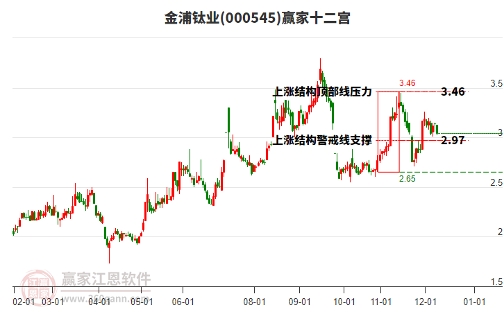 000545金浦鈦業(yè)根據(jù)贏家江恩極反通道趨勢工具展示,上方壓力位2.9458,下方支撐位2.2739。000545金浦鈦業(yè)處于贏家江恩多頭次主線形態(tài),12月19日發(fā)出江恩筑底信號后,經(jīng)過6日,今日形成