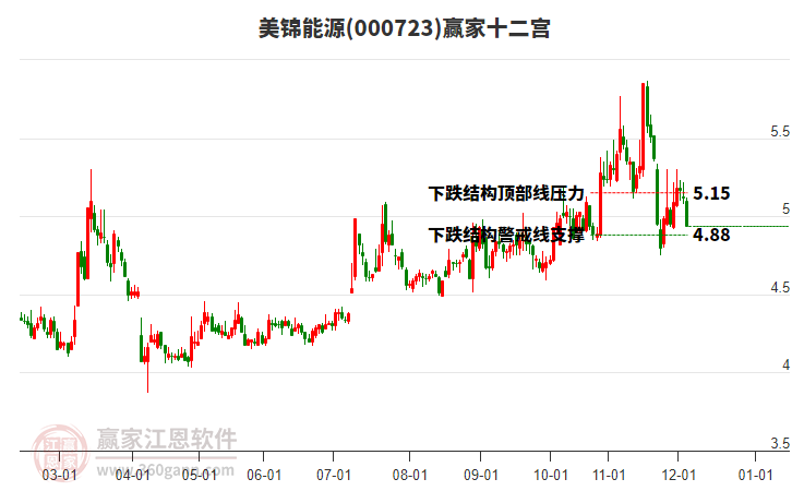 000723美錦能源根據(jù)贏家江恩極反通道趨勢工具展示,上方壓力位5.7792,下方支撐位5.0432。000723美錦能源處于贏家江恩多頭次主線形態(tài),從11月18日形成頂分型后持續(xù)下跌,重心下移,今日