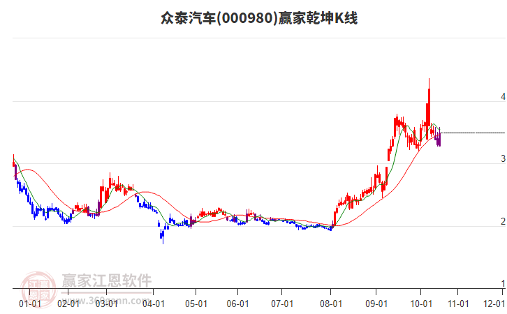 眾泰汽車(000980)處于贏家江恩多頭次主線形態(tài),11月19日發(fā)出江恩筑底信號后,經(jīng)過34日,今日形成短期筑頂信號,短期多頭趨勢已被破壞,中長期多頭趨勢依舊保持。眾泰汽車(000980)根據(jù)贏家江恩