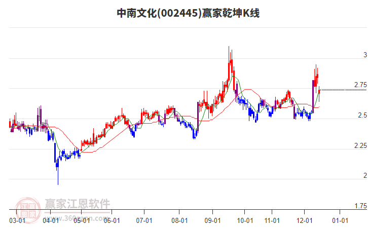 中南文化002445最高價上穿藍(lán)色外軌線 小幅上漲2.89%