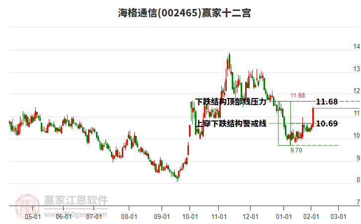 海格通信處于贏家江恩多頭主線形態(tài),從11月21日形成底分型后持續(xù)上攻,今日突破前高形成初次江恩筑底信號(hào),中期多頭趨勢(shì)延續(xù),但長(zhǎng)期處于回調(diào)中。海格通信根據(jù)贏家江恩極反通道趨勢(shì)工具展示,上方壓力位12.3
