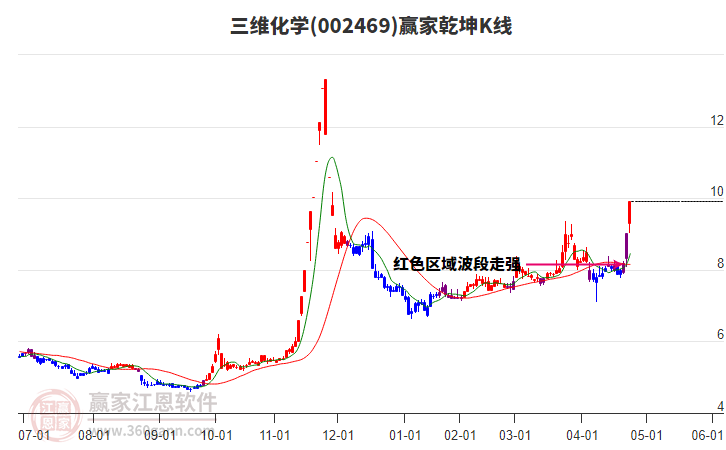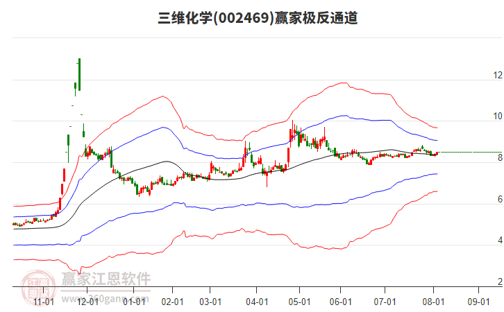 依據(jù)贏家江恩系統(tǒng)趨勢工具極反通道分析判斷三維化學(xué)002469運(yùn)行在生命線以下弱勢區(qū)域,根據(jù)規(guī)則該股短線輕倉參與,股價(jià)跌至弱勢外軌線后波段再結(jié)合其它工具信號建倉。應(yīng)用口訣是:生命線上強(qiáng)勢走,生命線下難抬頭;紅黃兩條外軌線,壓力支撐顯勢頭。