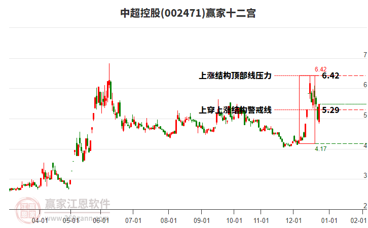 12月26日K線強(qiáng)勢(shì)漲停,目前受到5日前形成的上漲結(jié)構(gòu)頂部線6.42壓制,本輪自前方低點(diǎn)12月24日4.84元,上漲至今日已持續(xù)2日,多方能量得到釋放,空方能量逐漸增強(qiáng)。依據(jù)贏家十二宮結(jié)構(gòu)規(guī)則,股價(jià)若不能有效突破站穩(wěn)上漲結(jié)構(gòu)頂部線,多方能量逐漸衰竭,空方能量逐漸主導(dǎo),向下方警戒線5.29位置附近尋找新的平衡位。若向上突破站穩(wěn)頂部線6.42,有望突破前期形成的高點(diǎn)。