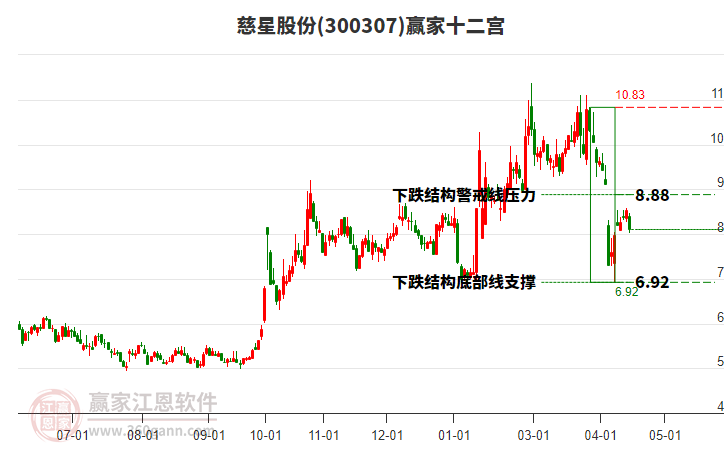 依據(jù)贏家江恩系統(tǒng)趨勢工具極反通道分析判斷慈星股份300307運行在生命線以上強勢區(qū)域,根據(jù)規(guī)則該股可短線、波段結(jié)合操作;結(jié)合物極必反的原理通過分鐘圖做盤中差價,應(yīng)用口訣是:生命線上強勢走,生命線下難抬頭;紅黃兩條外軌線,壓力支撐顯勢頭。