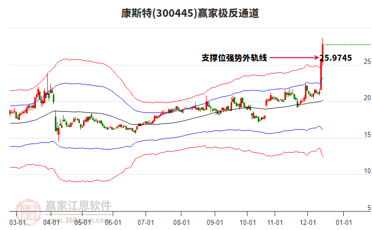 目前300445康斯特最高價22.52挑戰(zhàn)了贏家極反通道工具藍色外軌線,受到藍色外軌線強力壓制,最終收盤停留在在藍色外軌線與生命線上方的強勢通道區(qū)域。300445康斯特近10個交易日漲幅5.21%。