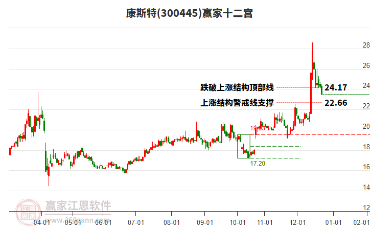 康斯特(300445)目前漲幅11.9%,走出獨立行情??邓固?300445)根據(jù)贏家江恩極反通道趨勢工具展示,上方壓力位25.1242,下方支撐位22.76??邓固?300445)處于贏家江恩多頭主