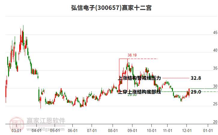 弘信電子處于贏家江恩多頭主線形態(tài),從11月24日形成底分型后持續(xù)上攻,今日突破前高形成初次江恩筑底信號,中長期目前都處于回調(diào)中。弘信電子根據(jù)贏家江恩極反通道趨勢工具展示,上方壓力位30.4314,下方