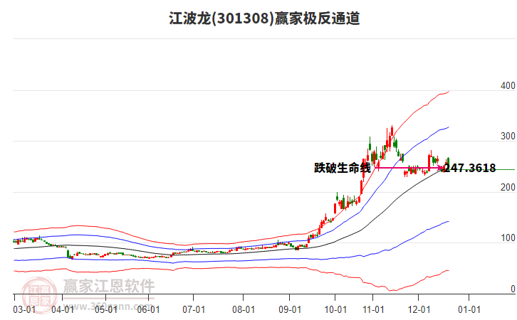 依據(jù)贏家江恩系統(tǒng)趨勢(shì)工具極反通道分析判斷江波龍301308運(yùn)行在生命線(xiàn)以下弱勢(shì)區(qū)域,根據(jù)規(guī)則該股短線(xiàn)輕倉(cāng)參與,股價(jià)跌至弱勢(shì)外軌線(xiàn)后波段再結(jié)合其它工具信號(hào)建倉(cāng)。應(yīng)用口訣是:生命線(xiàn)上強(qiáng)勢(shì)走,生命線(xiàn)下難抬頭;紅黃兩條外軌線(xiàn),壓力支撐顯勢(shì)頭。