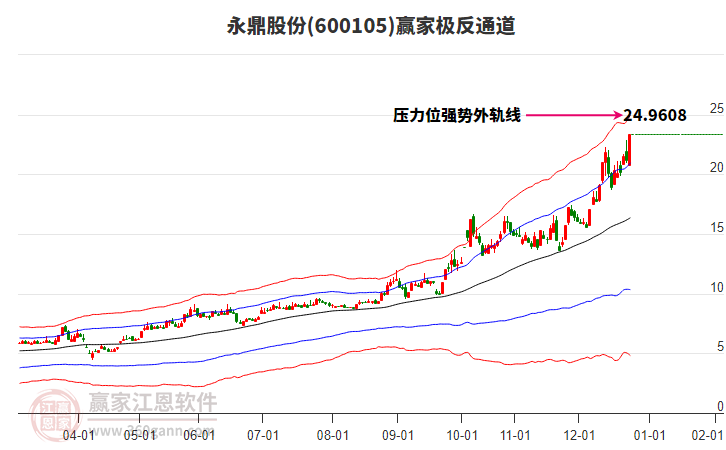 依據(jù)贏家江恩系統(tǒng)趨勢工具極反通道分析判斷永鼎股份600105運行在生命線以下弱勢區(qū)域,根據(jù)規(guī)則該股短線輕倉參與,股價跌至弱勢外軌線后波段再結(jié)合其它工具信號建倉。應(yīng)用口訣是:生命線上強勢走,生命線下難抬頭;紅黃兩條外軌線,壓力支撐顯勢頭。