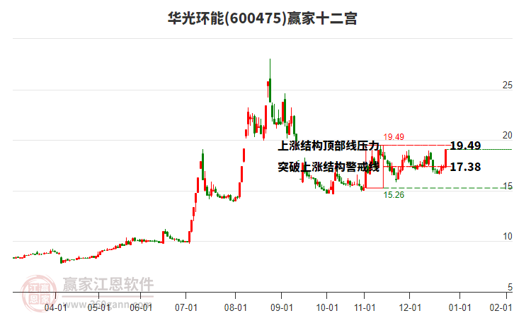 12月26日K線微跌1.8%,目前受到31日前形成的上漲結構頂部線19.49壓制,本輪自前方低點12月19日16.6元,上漲至今日已持續(xù)5日,多方能量得到釋放,空方能量逐漸增強。依據(jù)贏家十二宮結構規(guī)則,股價若不能有效突破站穩(wěn)上漲結構頂部線,多方能量逐漸衰竭,空方能量逐漸主導,向下方警戒線17.38位置附近尋找新的平衡位。若向上突破站穩(wěn)頂部線19.49,有望突破前期形成的高點。