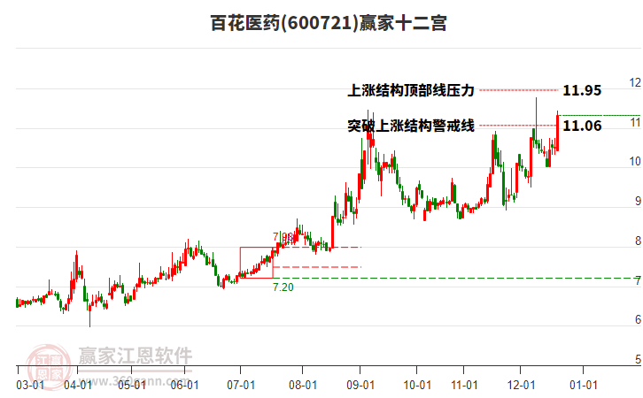12月26日股價(jià)目前上穿上漲結(jié)構(gòu)頂部線,股價(jià)自近期低點(diǎn)12月16日上攻至今日,漲幅達(dá)22.4%,多方能量得到一定的釋放,依據(jù)贏家十二宮結(jié)構(gòu)規(guī)則,股價(jià)突破上漲結(jié)構(gòu)頂部線,多方能量占據(jù)主導(dǎo)。若股價(jià)不能站穩(wěn)頂部線位置,屆時(shí)將出現(xiàn)能量失衡狀態(tài),多空雙方能量發(fā)生轉(zhuǎn)變,空方能量將會(huì)主導(dǎo)股價(jià),并向下警戒線附近尋找新的能量平衡位。