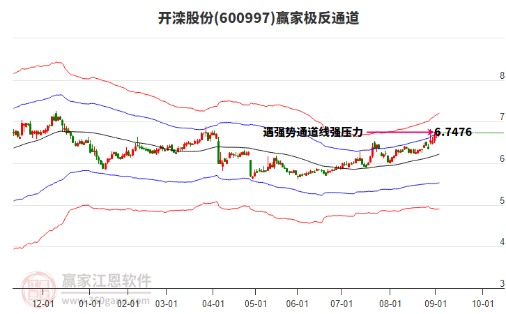 依據(jù)贏家江恩系統(tǒng)趨勢工具極反通道分析判斷開灤股份600997運行在生命線以下弱勢區(qū)域,根據(jù)規(guī)則該股短線輕倉參與,股價跌至弱勢外軌線后波段再結合其它工具信號建倉。應用口訣是:生命線上強勢走,生命線下難抬頭;紅黃兩條外軌線,壓力支撐顯勢頭。