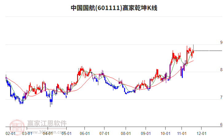 601111中國國航低開收穿頭破腳中陽線,中特估概念小幅上漲0.96%