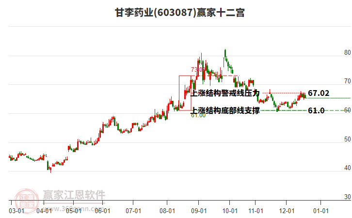 12月26日股價(jià)上穿83日前形成的上漲結(jié)構(gòu)警戒線位置,自前期低點(diǎn)12月3日,至今日股價(jià)上漲6.79元,漲幅11.04%。依據(jù)贏家十二宮多空能量守恒規(guī)則,上漲結(jié)構(gòu)警戒線是多空能量平衡點(diǎn),突破或跌破往往意味著平衡打破。 當(dāng)前股價(jià)若能站穩(wěn)警戒線67.02,則有望向上頂部線73.03位置尋找新的能量平衡位。若不能則會(huì)再次回調(diào)下探底部線61.0,尋找底部多空能量平衡位。