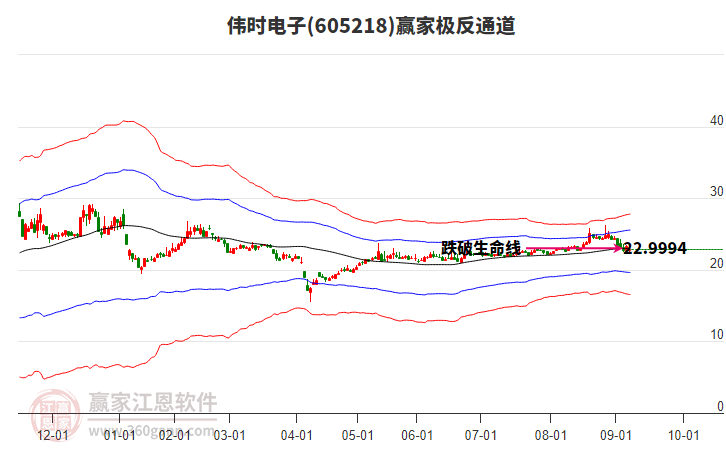 依據(jù)贏家江恩系統(tǒng)趨勢工具極反通道分析判斷偉時電子605218運行在生命線以下弱勢區(qū)域,根據(jù)規(guī)則該股短線輕倉參與,股價跌至弱勢外軌線后波段再結合其它工具信號建倉。應用口訣是:生命線上強勢走,生命線下難抬頭;紅黃兩條外軌線,壓力支撐顯勢頭。