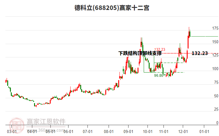 12月26日股價(jià)處于前期2025年10月17日形成的下跌結(jié)構(gòu)頂部線(xiàn)132.23上方,近期股價(jià)在此位置呈現(xiàn)震蕩走勢(shì),震蕩區(qū)間為114.03-183.72,今日收盤(pán)價(jià)145.51,小幅下跌4.77%。依據(jù)贏家十二宮多空能量守恒規(guī)則,下跌結(jié)構(gòu)頂部線(xiàn)是多空能量轉(zhuǎn)換的關(guān)鍵位置,多方能量已連續(xù)釋放,空方能量不斷聚集。當(dāng)前股價(jià)若能站穩(wěn)下跌結(jié)構(gòu)頂部線(xiàn)132.23,多方有望再一次發(fā)動(dòng)上攻,若跌破下跌結(jié)構(gòu)頂部線(xiàn),則股價(jià)將會(huì)向下警戒線(xiàn)位置附近尋找新的平衡位。