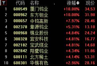 金屬板塊同樣走強(qiáng),廈門鎢業(yè)(600549)、東方鉭業(yè)(000962)漲停,中鎢高新(000657)、錫業(yè)股份(000960)、北方稀土(600111)等漲幅超4%。