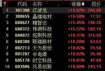 從盤面來看,存儲芯片概念持續(xù)爆發(fā),江波龍(301308)大漲19%,晶銳電材、精智達(dá)、兆易創(chuàng)新(603986)等10余股漲停。