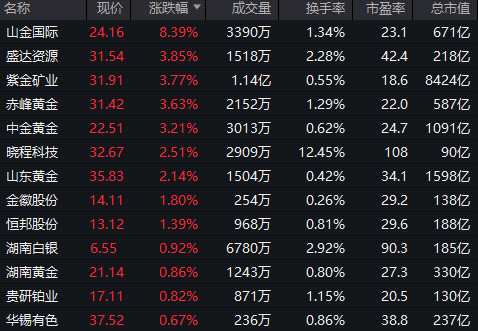 貴金屬概念股延續(xù)強(qiáng)勢(shì),山金國際(000975)漲超8%,盛達(dá)資源(000603)、紫金礦業(yè)(601899)、赤峰黃金(600988)等跟漲。