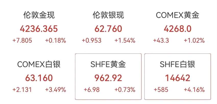 現(xiàn)貨白銀漲超1%,報(bào)62.76美元/盎司。滬銀主力合約日內(nèi)大漲4.16%,報(bào)14642元/千克。