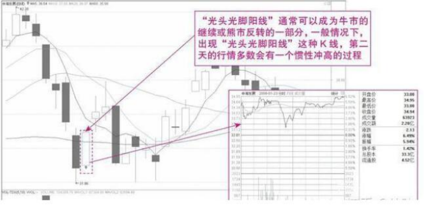 光腳的陽(yáng)線說(shuō)明買(mǎi)入陣容強(qiáng)大,攻擊力強(qiáng),全日股價(jià)穩(wěn)中有升,漲幅顯著。