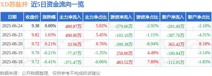 消息,截至2025年6月24日收盤,XD蘇鹽井(603299)報收于9.38元,上漲0.0%,換手率1.32%,成交量10.28萬手,成交額9570.65萬元。